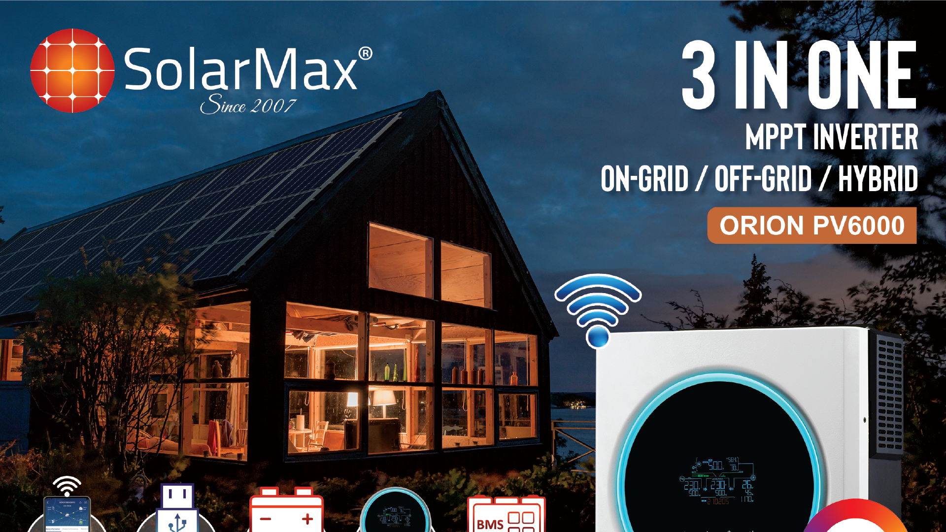 SolarMax Orion Series Smart Inverter With Colourful LED Light, First time in Pakistan Solar Hybrid Inverter With Life Time Service Warranty .ON-GRID/OFF-GRID/ With Energy Storage (Hybrid), Mobile App, Software Monitoring & Control, Remote Monitoring & Works With or Without battery